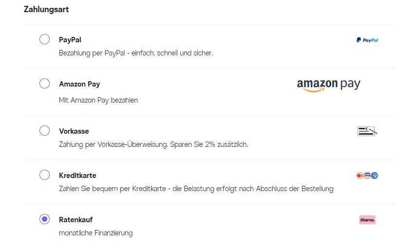 Płatność ratalna jest również możliwa u naszego dostawcy usług płatniczych Klarna. W tym celu wybierz odpowiednią metodę płatności w koszyku i postępuj zgodnie z instrukcjami Klarna.